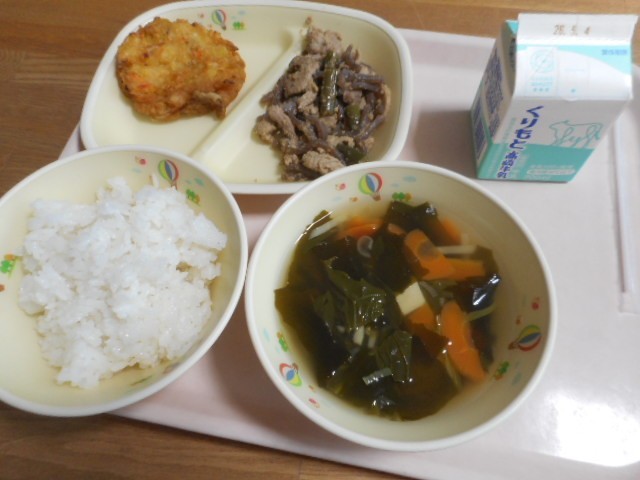 ごはん、牛乳、彩りかき揚げ、若竹汁、こんにゃくと豚肉のごま煮