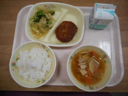 ごはん、牛乳、甘辛メンチ、凍り豆腐の味噌汁、ブロッコリーのおかか和え