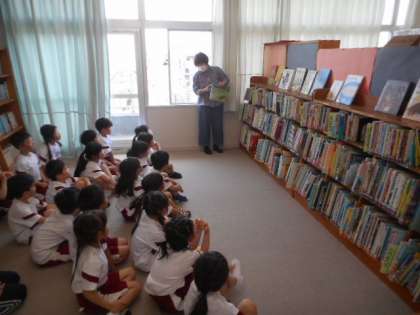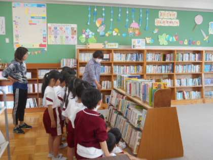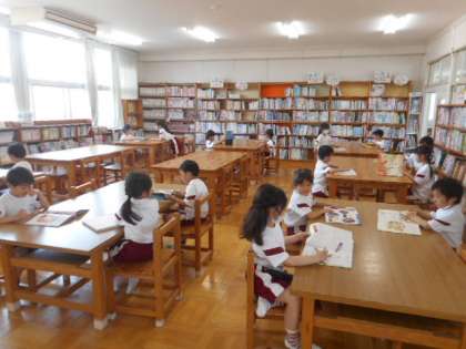 学校図書館の使い方を司書さんから教えてもらい、自分の好きな本を選んで読みました。