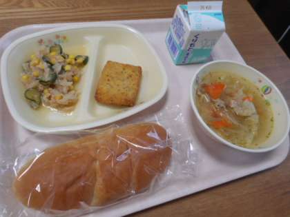ロールパン、牛乳、フィレオチキン、キャベツスープ、ツナサラダ