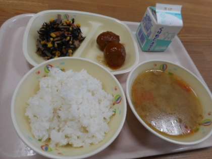 五班、牛乳、肉団子、豚汁、コーン入り磯煮