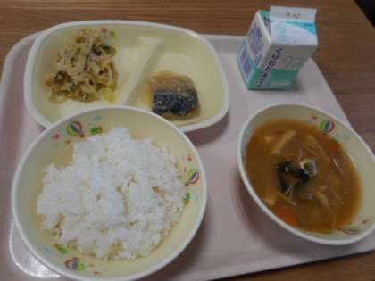 ごはん、牛乳、サバの味噌煮、とうふとわかめの味噌汁、かみかみ和え