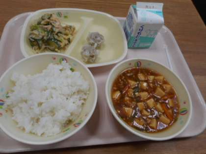 ご飯、牛乳、しゅうまい、マーボー豆腐、バンバンジーサラダ
