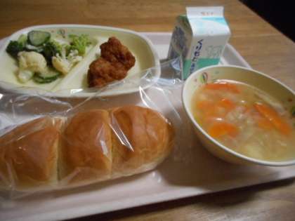 ロールパン、牛乳、とりの唐揚げ、新タマネギのスープ、花野菜サラダ