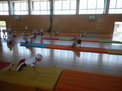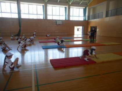 リレー運動あそびやマット運動あそびでからだを動かしました。