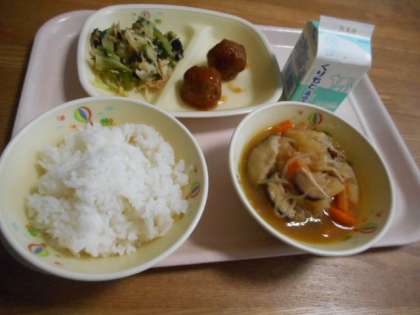 ご飯、牛乳、肉団子甘酢あん、肉じゃが、カミカミ和え