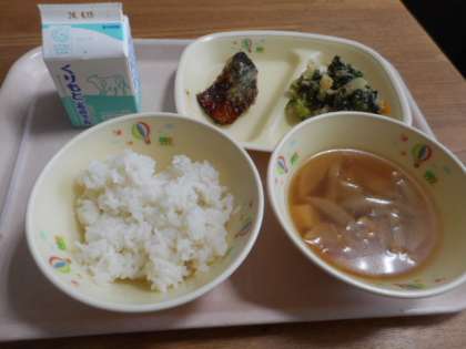 ご飯、牛乳、さばのいそ風味漬け、根菜汁、ごま和え