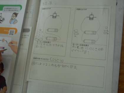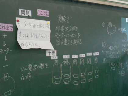 乾電池2個をつないでモーターが速く回るつなぎ方を調べました。