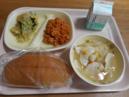 背割りパン、牛乳、スラッピージョー、ラビリオスープ、わかめとこんにゃくのサラダ