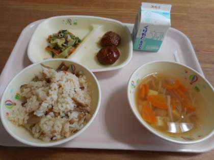 かみなりごはん、牛乳、照り焼きつくね、すまし汁、小松菜サラダ