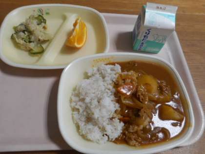 麦ご飯、牛乳、ポークカレー、チキンサラダ、オレンジ