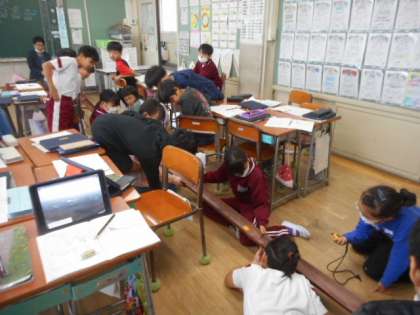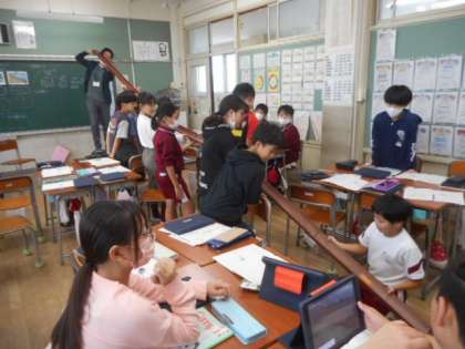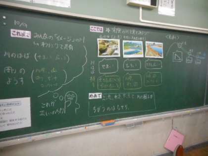 上流、中流、下流の水の流れを予想し、実験を通して考えました。