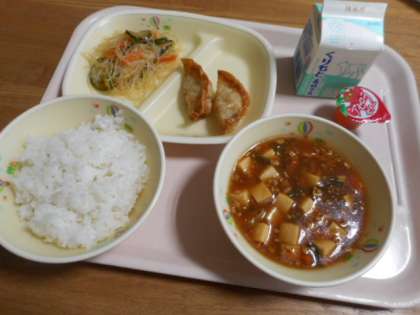 ごはん、牛乳、揚げギョウザ、マーボー豆腐、春雨サラダ、ミニアセロラゼリー