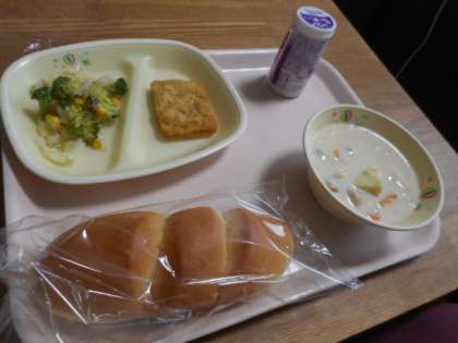 ロールパン、ジョアブルーベリー、フィレオチキン、さつまいものシチュー、ブロッコリーサラダ