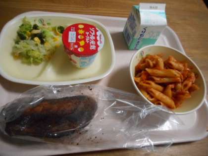 ミニココアあげパン、牛乳、秋野菜のペンネ、アーモンドサラダ、ヨーグルト