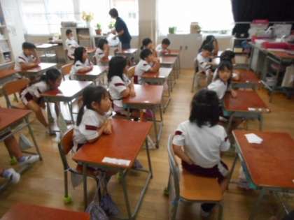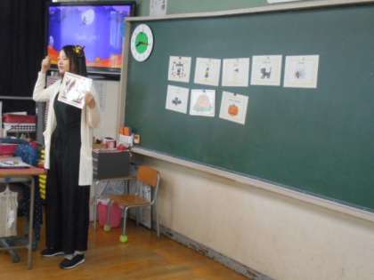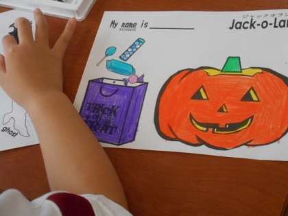 ハロウィンの時に使う英語を聞いたり話したり、絵に表したりして楽しみました。