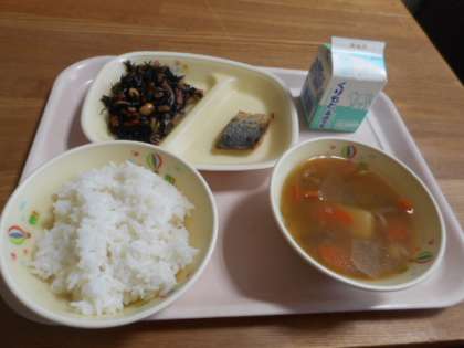 ごはん、牛乳、さわらの西京焼き、とっちゃなげ汁、ひじきの磯煮