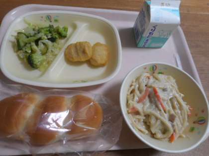 小さめロールパン、牛乳、チキンナゲット、豆乳クリームスパゲティ、グリーンサラダ
