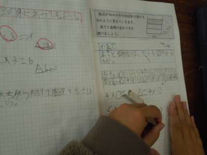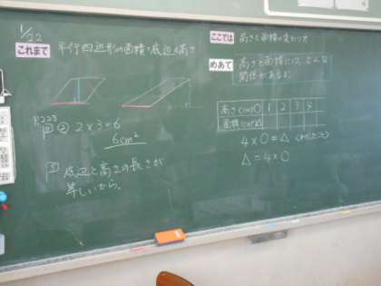 平行四辺形の高さと面積の関係を考えました。