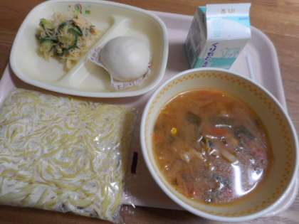 パック中華麺、牛乳、ミニ肉まん、味噌ラーメンスープ、バンバンジーサラダ
