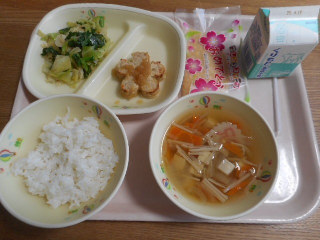 ごはん、牛乳、お花の豆腐ハンバーグ、すまし汁、かきなのオイル和え、お祝いイチゴクレープ