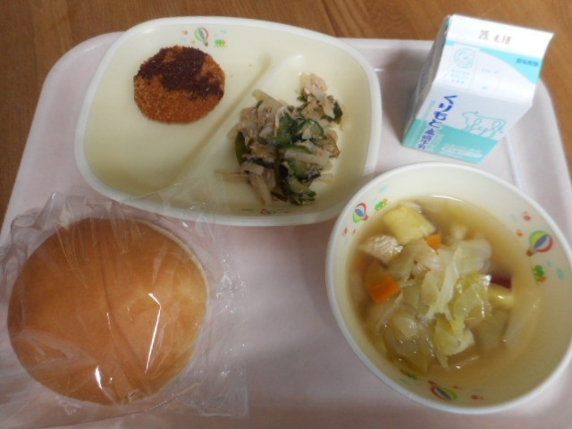 丸パン横切り、牛乳、ハムカツ、野菜たっぷりスープ、海草ツナサラダ