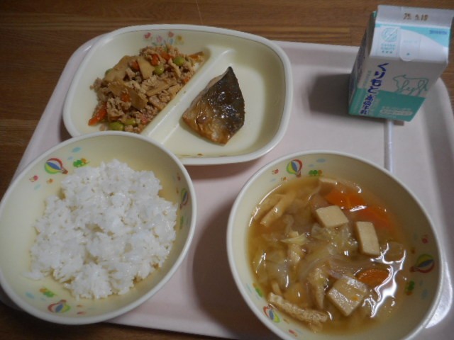 ごはん、牛乳、タケノコごはんの具、ぶりの照り焼き、春野菜の味噌汁