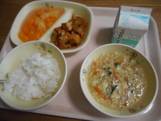 ごはん、牛乳、酢豚風いため、チンゲンサイの卵スープ、アセロラジュレミックス