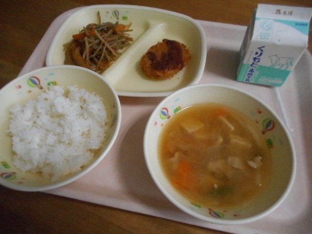 ごはん、牛乳、かみかみフライ、いんげんのみそ汁、五目きんぴら