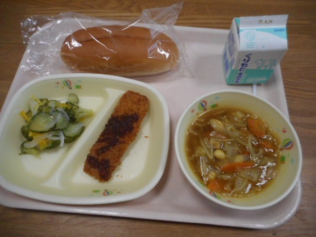 せわりパン、牛乳、白身魚のスティックフライ、野菜カレースープ、野菜のマリネ