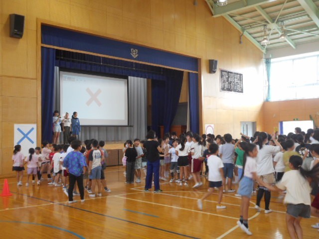 みんなで仲良くなって、いじめを防止しようという趣旨で、「猛獣狩り」「○×クイズ」でみんなで楽しみました