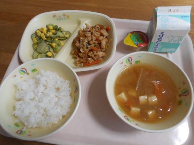 ご飯、牛乳、五目ご飯の具、豆腐汁、ブロッコリーサラダ、ミニピーチゼリー