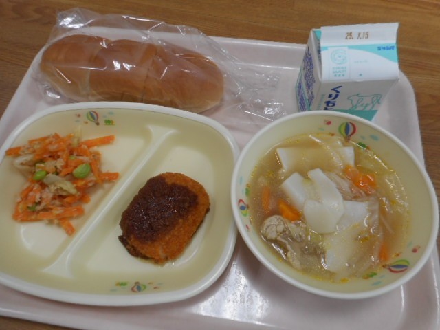 ロールパン、牛乳、かにクリームコロッケ、コンソメワンタンスープ、にんじんサラダ
