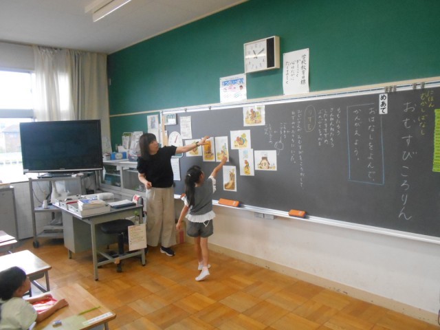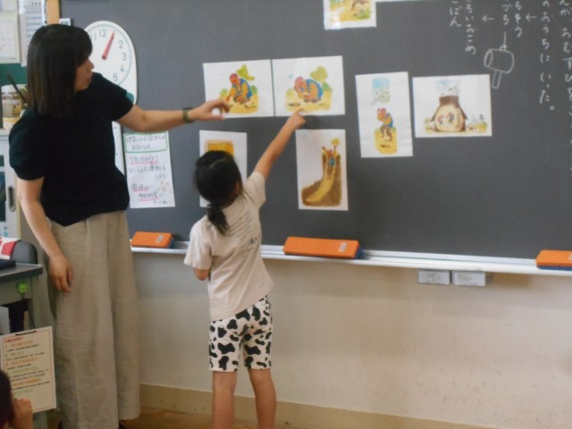 場面絵を見て、お話の順番に並び替えていました。