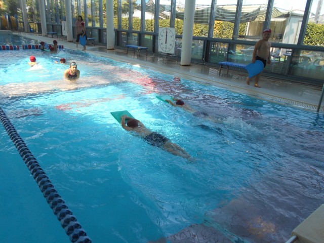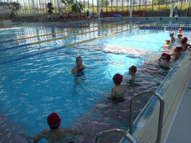2年生水泳の授業の様子です。今日は、外も猛暑日、8時30分の外の気温はすでに30度を超えています。そんな中、2年生の皆さんは、はみずとぴあの指導員さんにお世話になって、水泳の授業が始まりました。