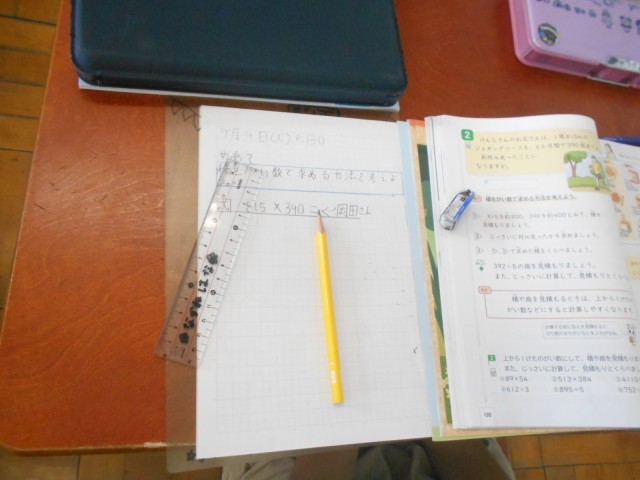 今日のめあては「積をがい数で求める方法はどうしたらよいだろうか?」