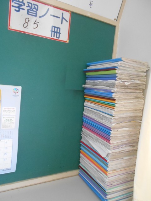教室の隅には、積み上げられた家庭学習ノートがありました。がんばれ4年2組!