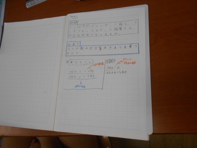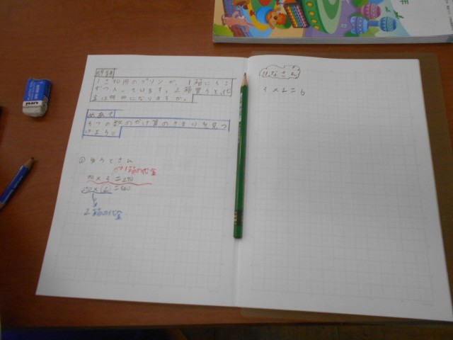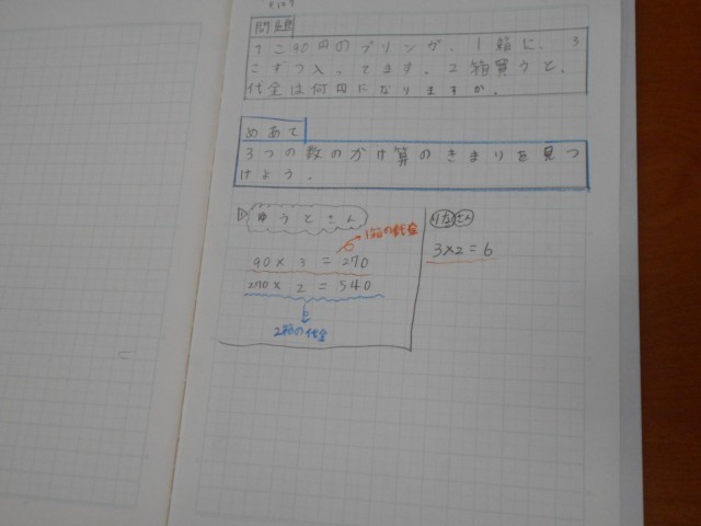 問題「1コ90円のプリンが一箱の中に3こずつ入っています。2箱買った時の代金はいくらでしょう?」