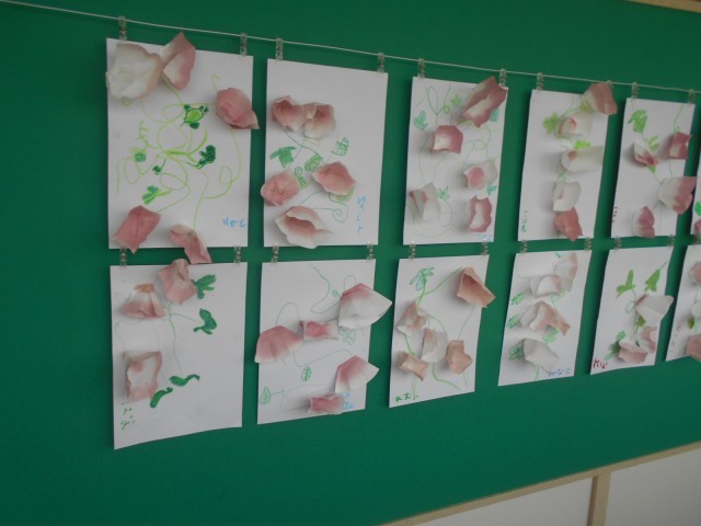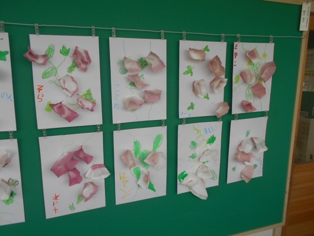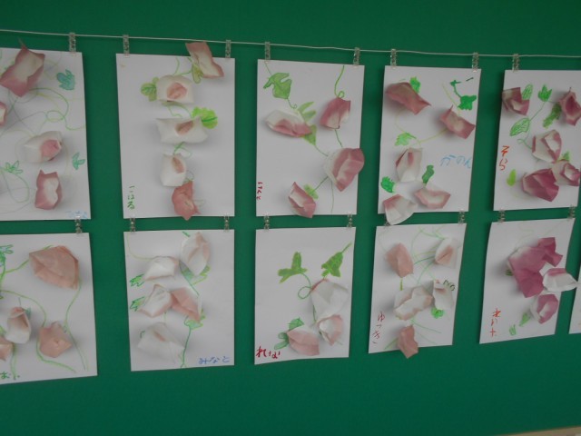 廊下に出てみると、昨日の「シャボン玉」の絵からあさがおの作品に変わっていました。