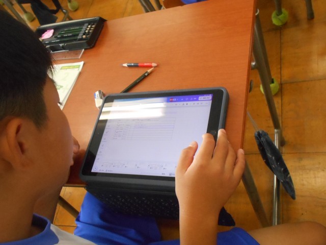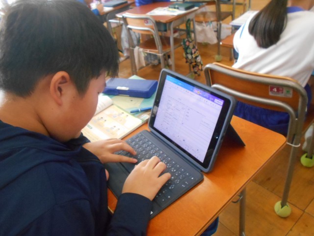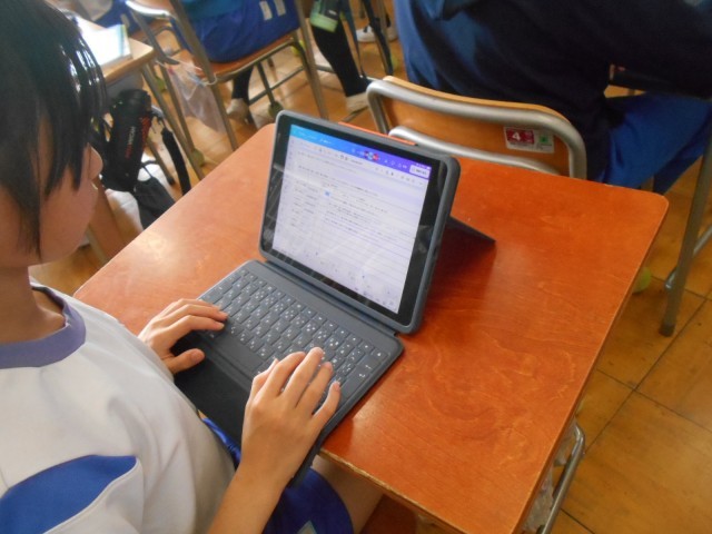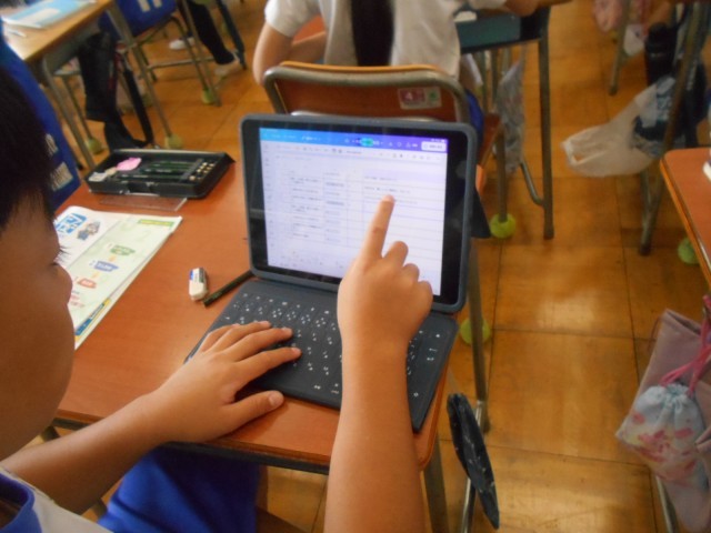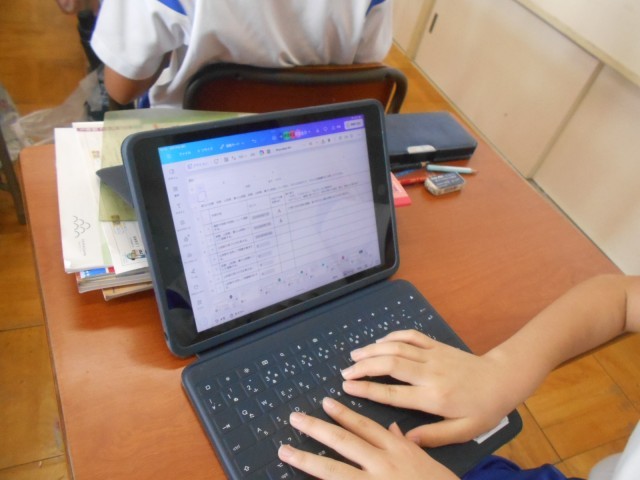 子どもたちは、「振り返り」をシートに打ち込んでいました。