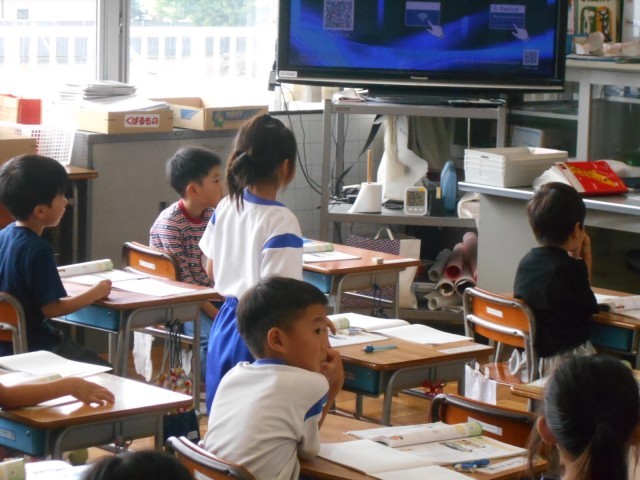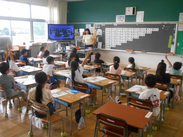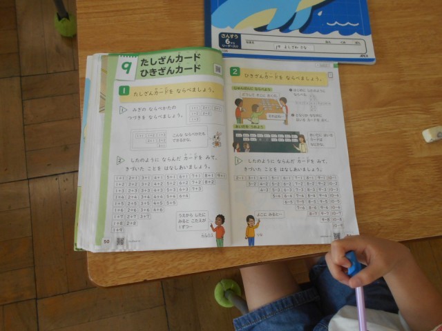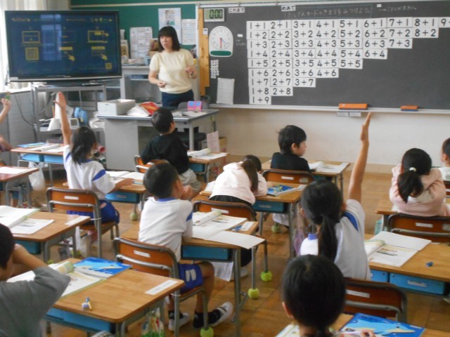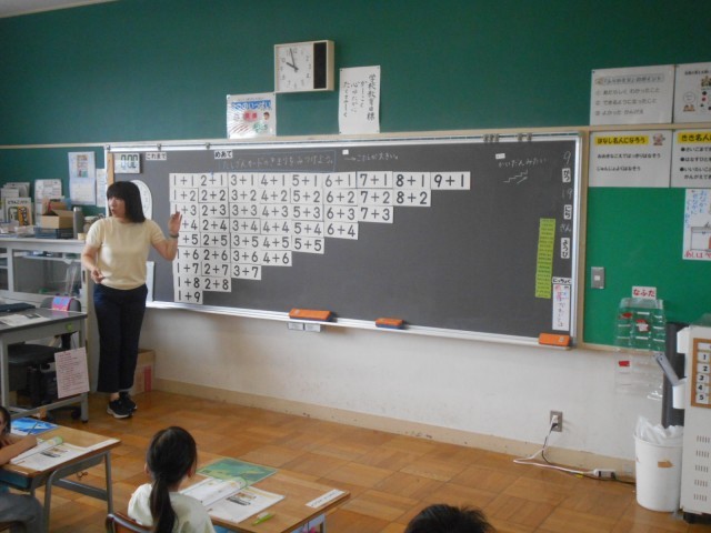 びっしりと黒板に貼られたたし算カードをじっくり見て、気がついたことをどんどん発表しました。友達の意見を聞いて、自分が気付かなかった新たな気づきもたくさんあったようです。