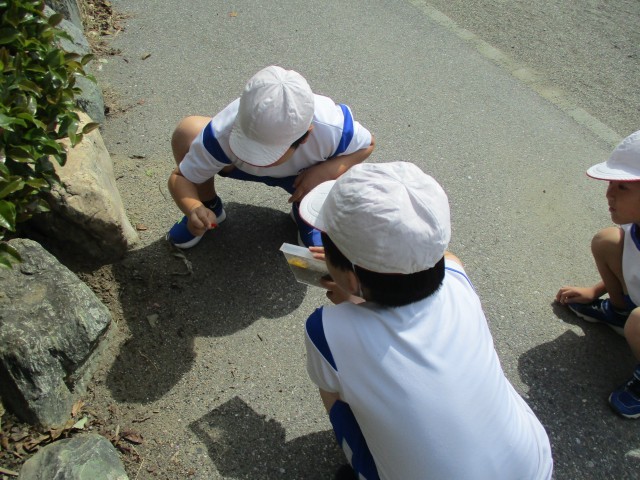 その傍らで、ありの研究をしている二人を発見。花壇のそばでありを捕まえて、専用のキットにたくさん集めていました。夏休みは終わりましたが自由(自己)研究は続いているようです。