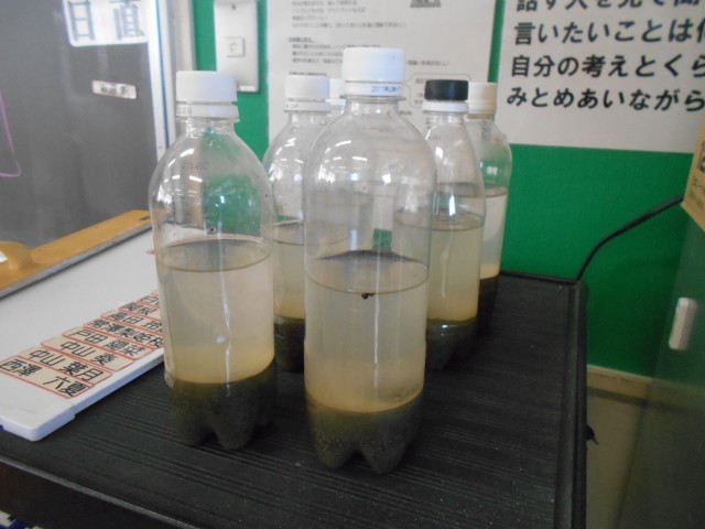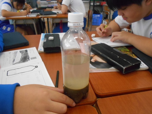 先生が用意してくださった実験装置(ペットボトルに水と泥や砂が入っているようです)?を使って、予想を検証していました。