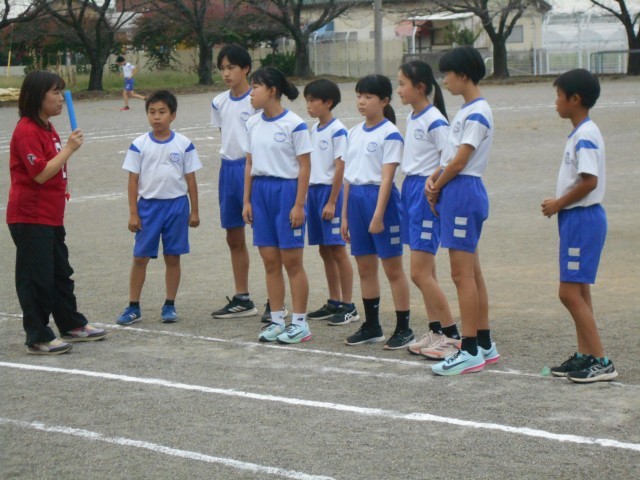 練習の最後には、リレー選手が集められ、バトンパスのポイントを教わり、実際に練習し確認していました。