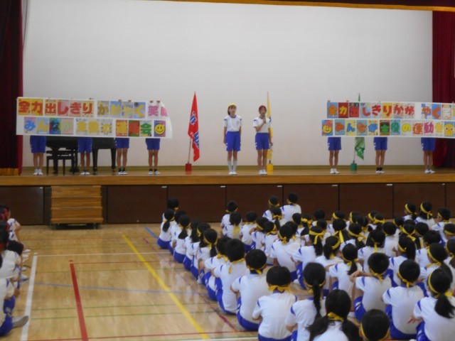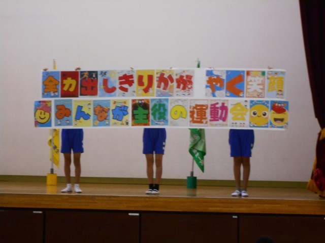 「全力出し切り かがやく笑顔 みんなが主役の運動会」。6年生全体で考えたスローガンを発表してくれました。