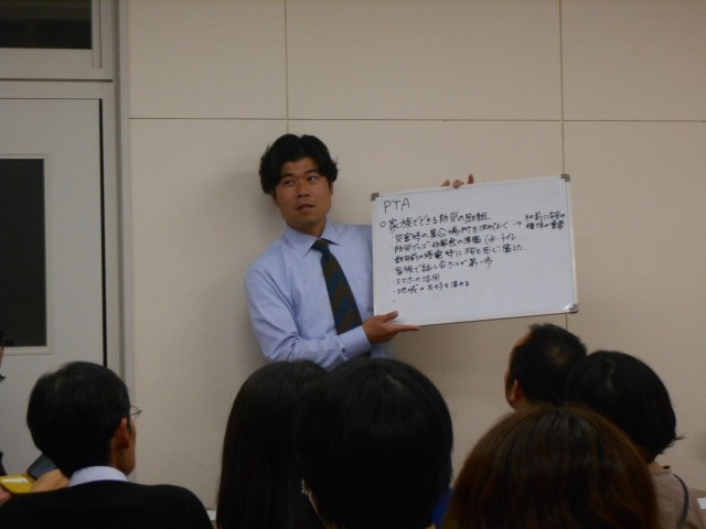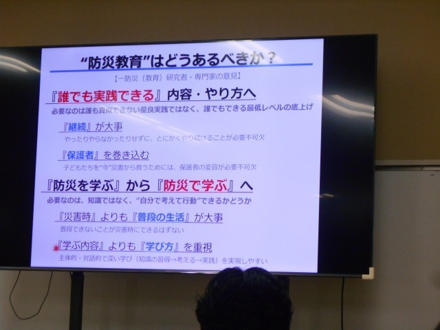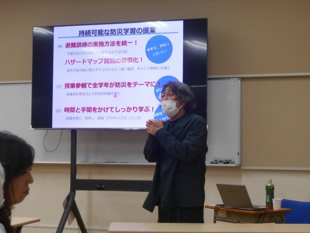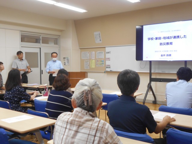 藤岡市は県教委から北中学校で、藤岡市の防災アドバイザーである群馬大学大学院 金井昌信教授をお迎えし、防災についてのお話を聞きました。参加者はP役員、ぽらりす委員、教職員です。