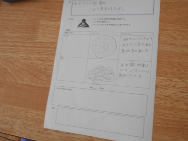 「双眼実体顕微鏡」をつかって、火山灰と溶岩を調べて比較していました。