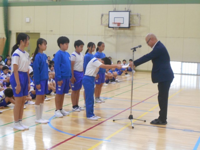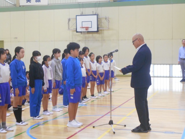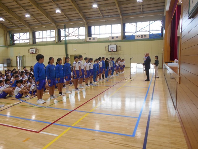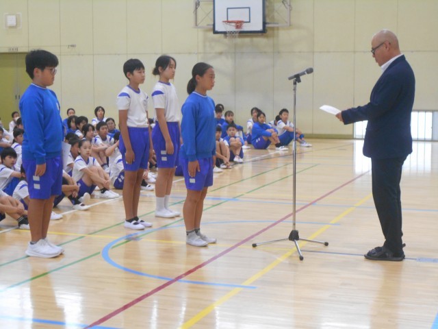 14日(火)朝、体育館に全校児童が集まって、後期役員の任命式を行いました。
