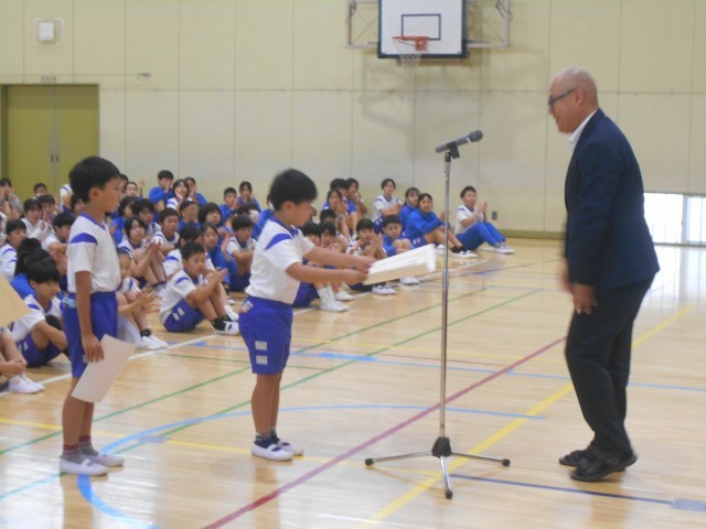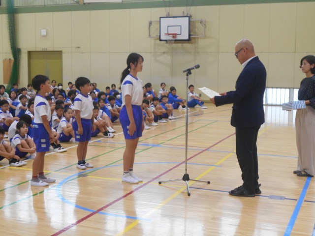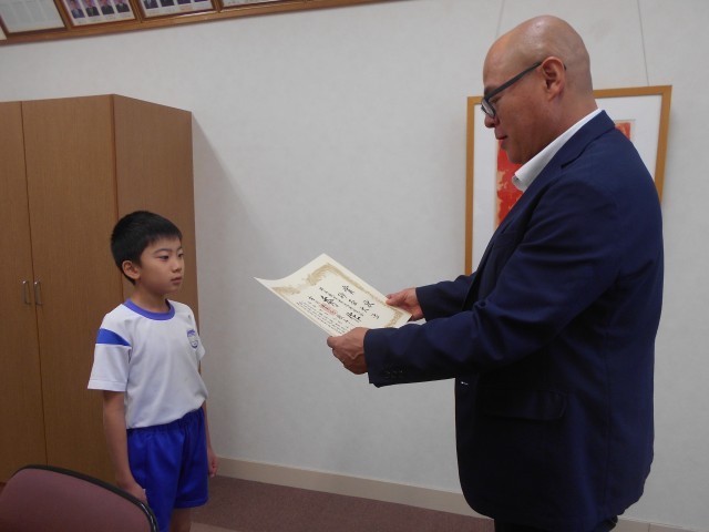 社会体育や各種団体主催の大会の表彰は、20分休みに校長室で行いました。