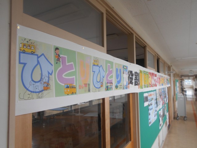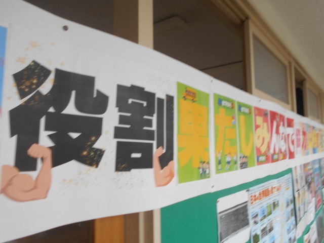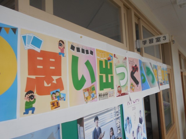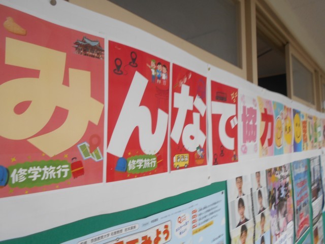 3階のフロア、6年1組と2組の間にある教室廊下側の壁には修学旅行のスローガンも掲げられています。
